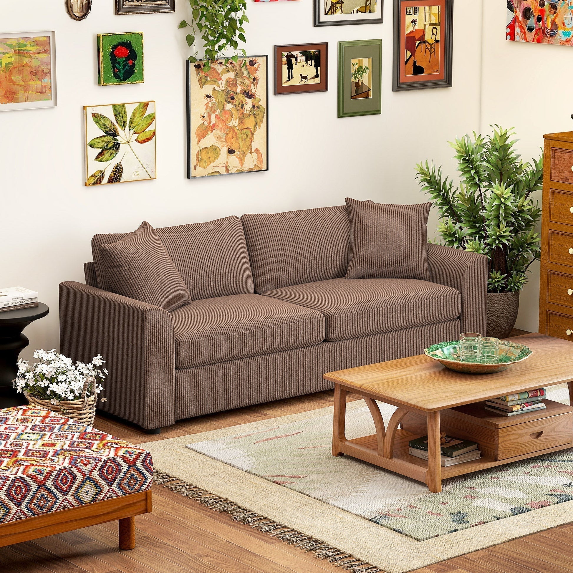 HOMCOM Modern 3 Seater Sofa with Spring Cushion, 212 cm Fabric Jumbo Cord Sofa Couch with 2 Scatter Cushions, Upholstered Corduroy Settee for Living Room, Bedroom, Home Office, Coffee
